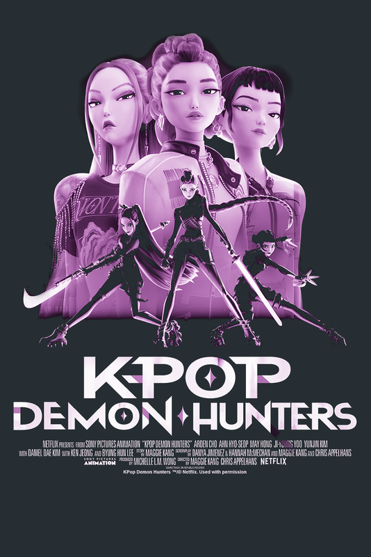 KPop Demon Hunters Huntrix Billboard Poster Oversized T-shirt available in sizes S, M, L, XL, XXL.
